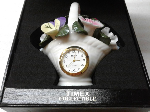 Vintage collectible procelain flower basket mini clock in original gift box. New, unused, 4"H x 3"W